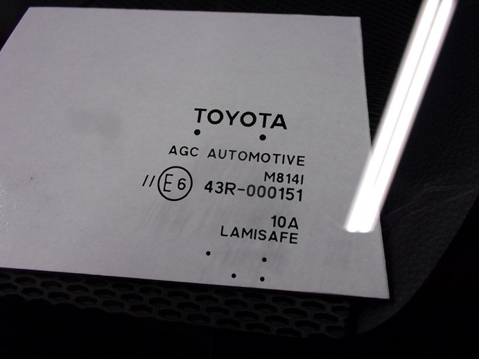 今回交換したガラスの種類は、デジタルテレビアンテナ・遮音・運転支援システム用カメラ対応のトヨタ純正ガラスです。
