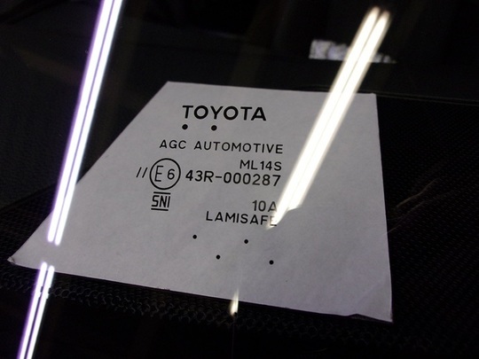 今回交換したガラスの種類は、ブルーボカシ・レインセンサー・デジタルテレビアンテナ・遮音・HUD・運転支援システム用カメラ対応のトヨタ純正ガラスです。