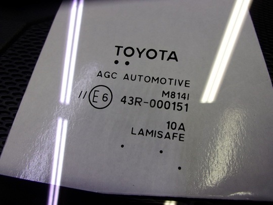 今回交換したガラスの種類は、デアイサー・デジタルテレビアンテナ・遮音・運転支援システム用カメラ対応のトヨタ純正ガラスです。