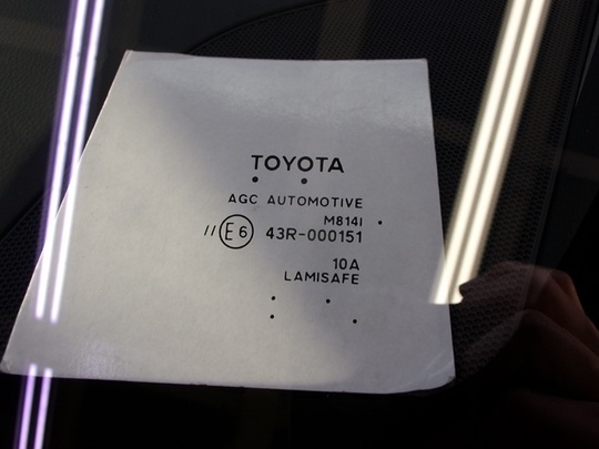 今回交換したガラスの種類は、レインセンサー・デアイサー・デジタルテレビアンテナ・運転支援システム用カメラ対応のトヨタ純正ガラスです。